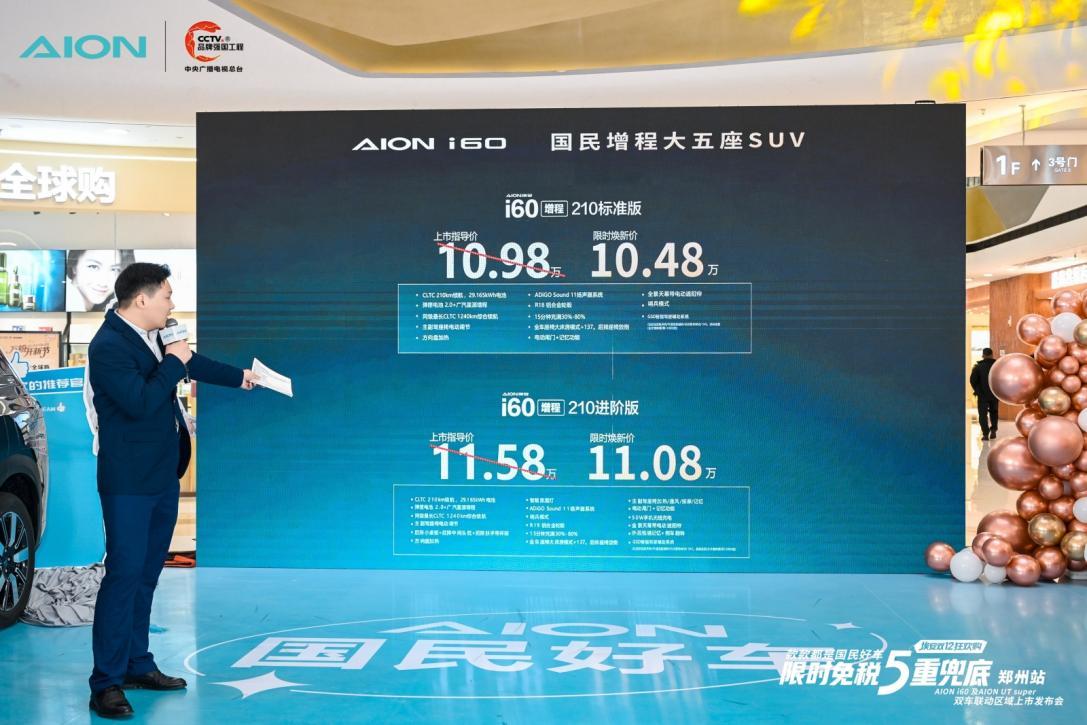 针对埃安 i60(10.48 万起),郑州家庭用户可享定制 “5 重兜底礼”:含至高 6000 元购置税兜底的免税礼、至高 5000 元焕新置换补贴、至高 5000 元金融贴息、价值 2600 元养护礼包,以及 “烧一赔三” 终身品质保障;叠加郑州本地限时政策,进一步拉低 10 万级家用 SUV 的入手门槛。