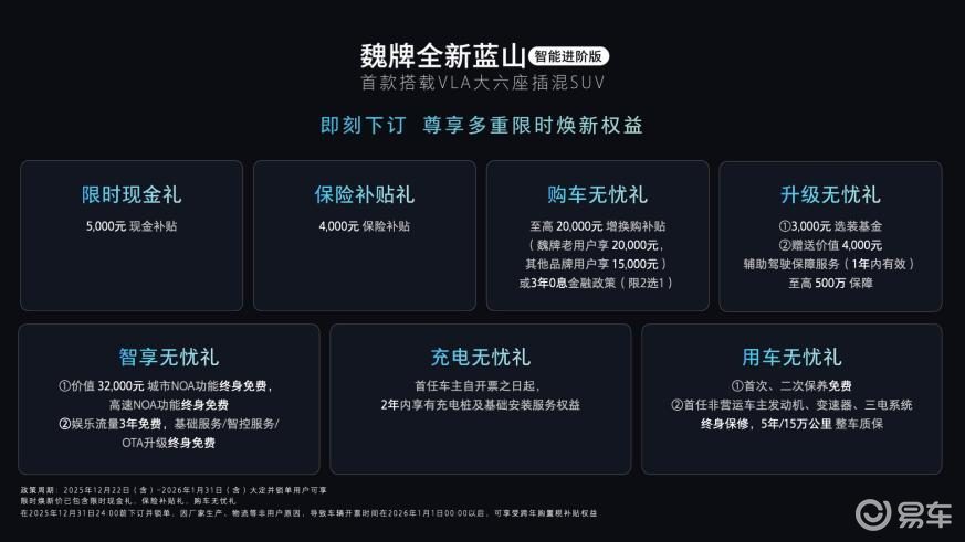 目前,新车限时焕新价27.58万元起,叠加5000元现金补贴、4000元保险补贴、至高20000元增换购补贴等多重权益,性价比优势显著。如果你正在寻找一款兼顾智能、安全、舒适与效率的家庭SUV,魏牌全新蓝山智能进阶版无疑是值得优先考虑的选择。带上家人,开着它奔赴每一场山海之约,让每一次出行都充满安心与愉悦。