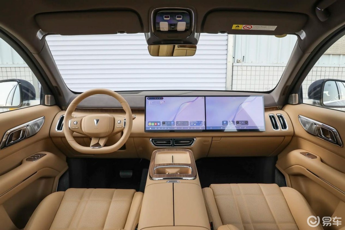 而深蓝S09的内饰兼顾舒适和科技感,中控台前方也采用了三辐式方向盘,并运用皮质材料,但暂时不支持记忆和加热功能,换挡方式采用电子式怀挡,方便操控。智能车机包括15.6英寸中控屏、15.6英寸副驾娱乐屏、21.4英寸后排液晶屏、43英寸增强显示抬头显示系统,其中中控屏采用Harmony OS操作系统,具备5G网络、语音识别、应用下载等功能。其次,车内还标配了自动防眩目内后视镜、256色氛围灯等配置。