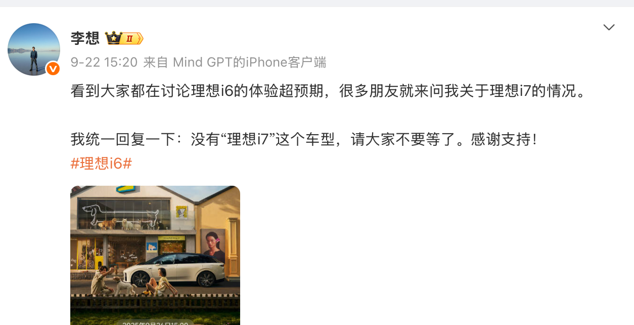 正因为此,i7似乎也没有必要再出现了。李想本人证实了这一点,他表示:统一回复没有“理想i7”这个车型,请大家不要等了。”
