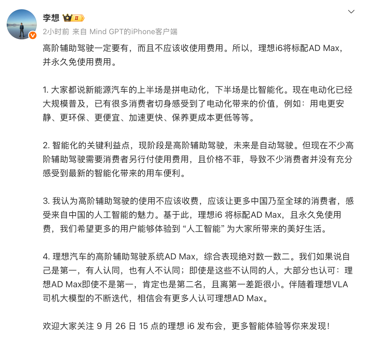 9月24日,李想本人发微博再曝i6新车猛料。