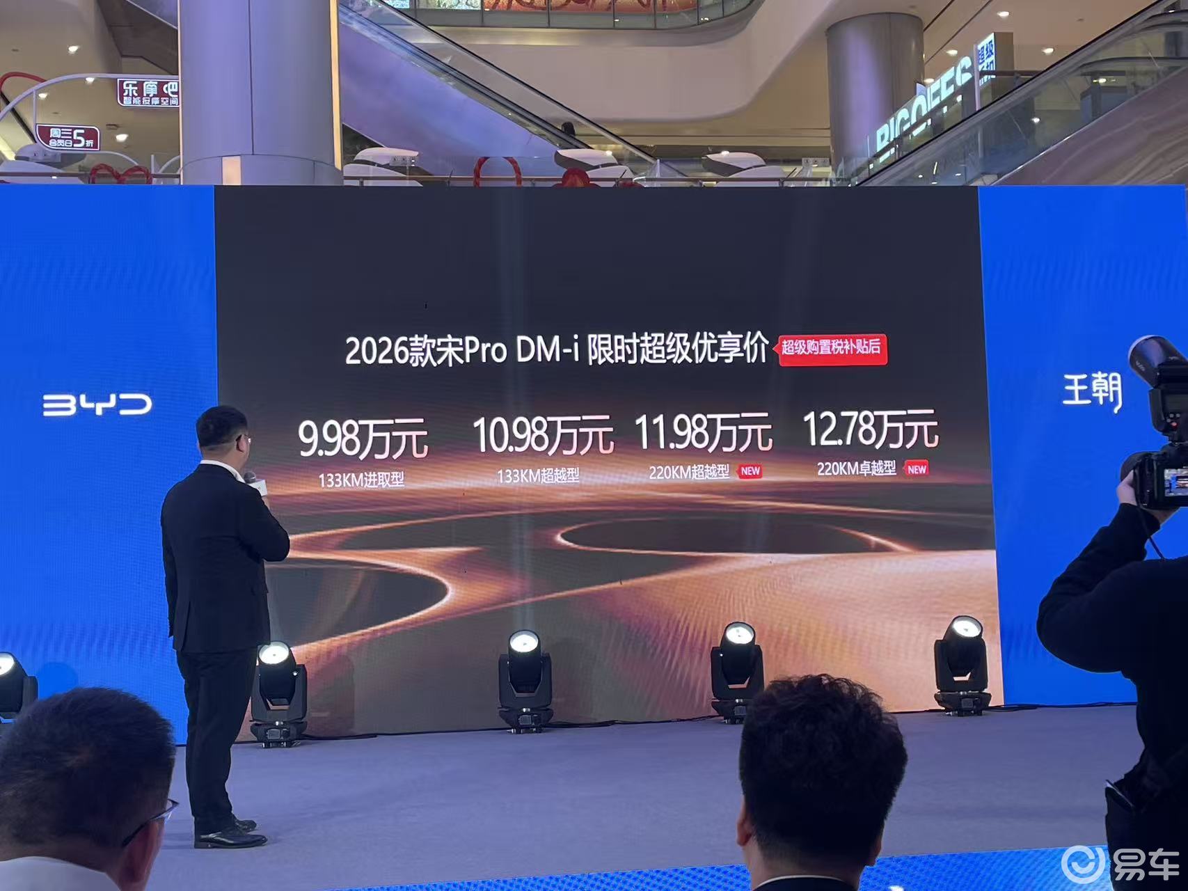 其中,2026款秦L DM-i 210KM长续航版限时超级优享价11.28-12.28万元;2026款秦PLUS DM-i 210KM长续航版售价8.98-9.98万元;2026款宋Pro DM-i 220KM长续航版限时超级优享价11.98-12.78万元。