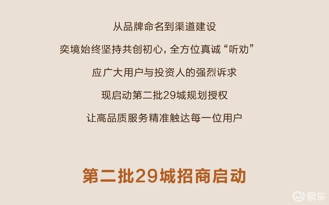 第二批共29城招商启动就在新车冬测伪装图曝光次日,品牌方又有新“动作”。奕境汽车对外宣布:已启动第二批共29城之招商。据悉,自该品牌首批50城招商启幕以来,共有超过200家投资主体报名,其渠道建设亦迎来快速增长,并覆盖了2025年国内新能源汽车销量排行前十之城市。