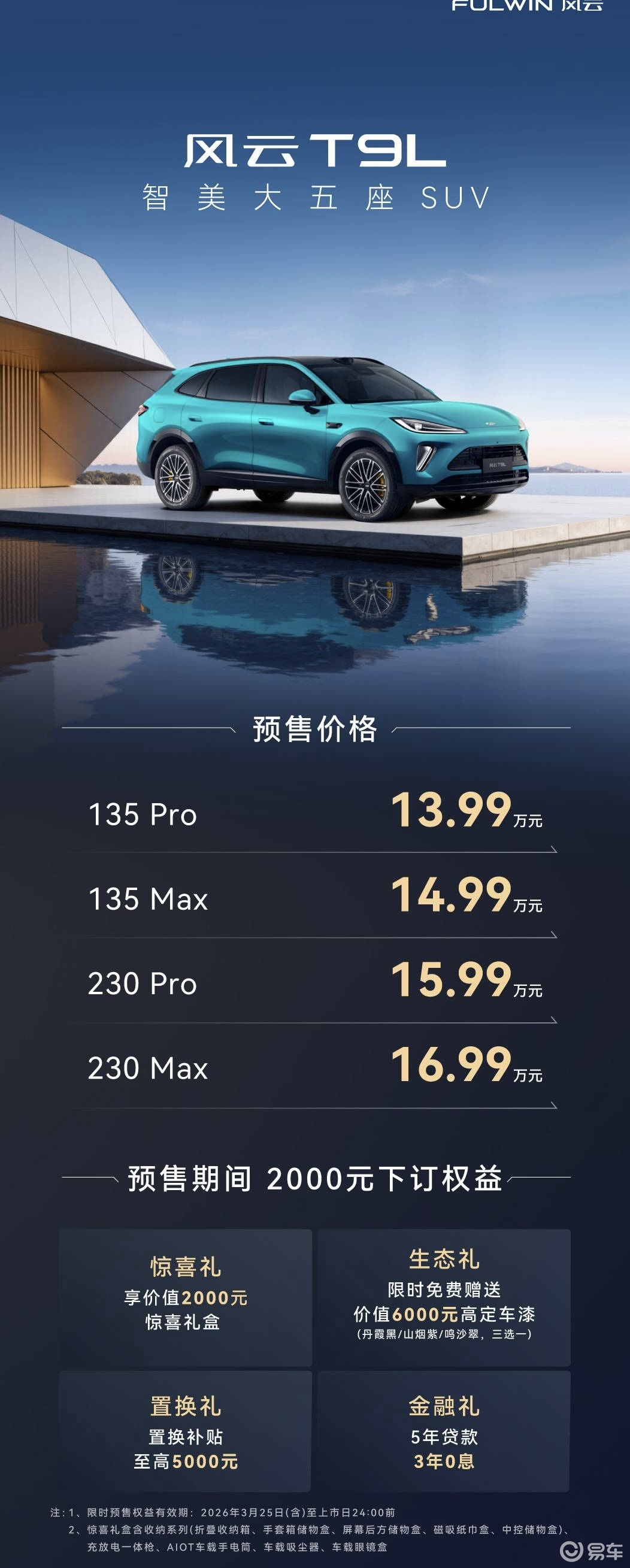 2026年3月25日,奇瑞风云品牌正式开启风云T9L的预售,预售价13.99万元起。这款定位“智美大五座SUV”的新车,试图用“大、美、超、享”四个关键词,回答一个更本质的问题:新时代中国家庭,到底需要一台什么样的SUV?