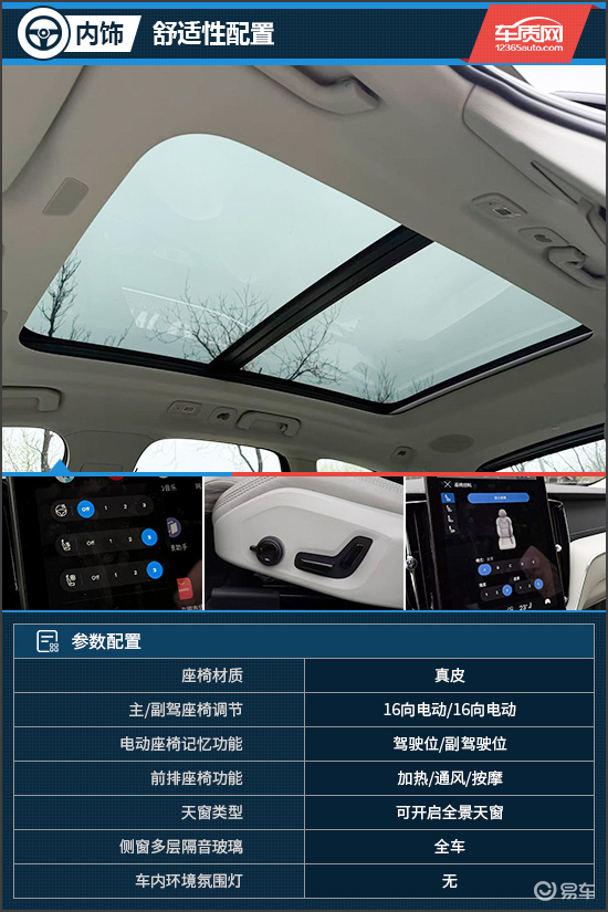 舒适性配置方面,前排人体工程学座椅支持多向电动调节、腰部支撑及座垫延伸,提供更为舒心的乘坐体验。可开启全景天窗采用深色夹层玻璃,有效减少眩光与外部噪音,遮阳帘可设置为当车内温度升至25摄氏度时自动关闭,确保乘坐舒适。此外,车内还装配了双效增强型空气净化系统,可高效过滤95%的PM2.5颗粒物,去除高达97%经空气传播的病毒和99%的花粉,让车内时刻保持清新洁净。