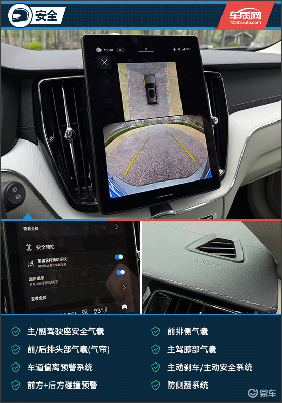 安全配置方面,评测车提供了丰富的主动和被动安全配置,如主驾膝部气囊、主动刹车/主动安全系统、前方+后方碰撞预警以及防侧翻系统等功能均有配备,能够为通勤或远游提供周全的安全防护。