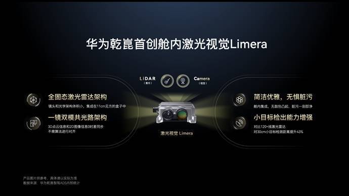 舱内激光视觉Limera(问界M7 Pro+同款):全固态激光雷达,无机械运动部件,3D点云与2D图像零时差同步。对30厘米高度的小目标检出距离提升43%,雨雾天气全天候可用。
