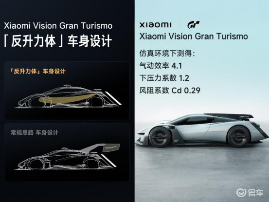 小米Vision GT采用了反升力体的车身设计,无需额外的风刀以及大尾翼等空气动力学套件加持,设计简洁的同时最大程度提高空气动力学性能并增加下压力。仿真环境下测得它的气动效率为4.1,下压力系数达到1.2,风阻系数为0.29Cd。同时小米Vision GT的轮毂也非常有亮点,它的样式非常像一个黑洞,并且通过磁悬浮技术让它能够实现轮胎转而轮毂不转,这样的设计不仅有助于散热,还能有效减少风阻,这套设计可以说很好地兼顾了美学和实用性。